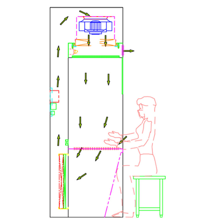 稱量亭潔凈氣流被送至送風箱體內,90%通過均流送風網板,形成均勻的垂直送風氣流,10%則通過風量調節(jié)板,排出設備。所有氣流均經過高效過濾器處理,所以送風,排風均不帶殘余粉塵,避免了二次污染。